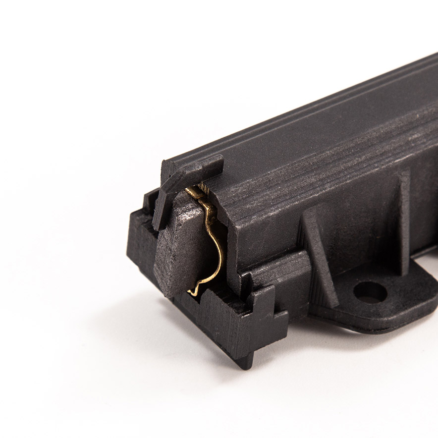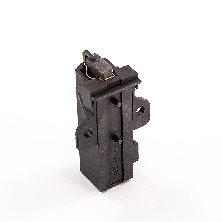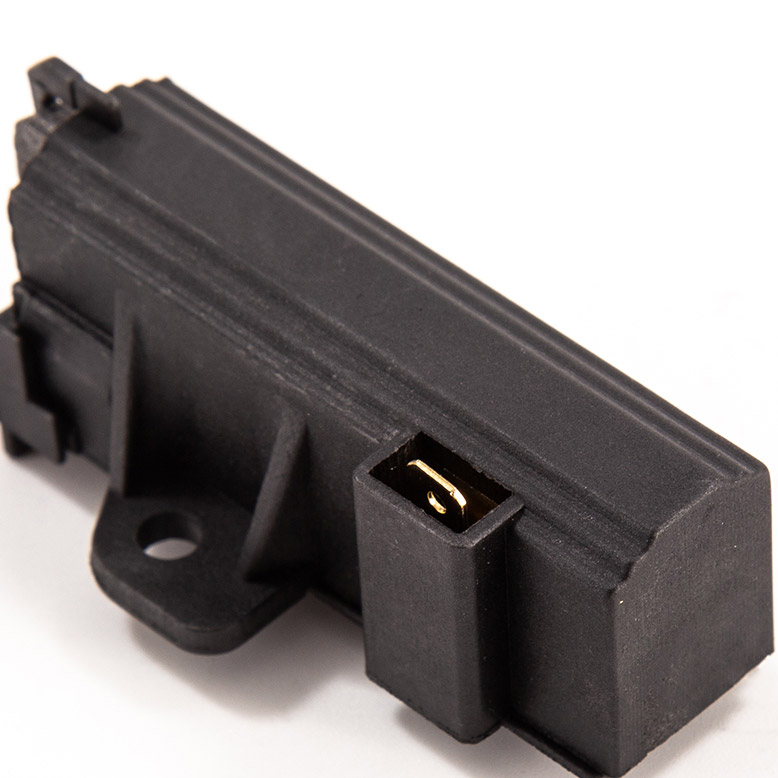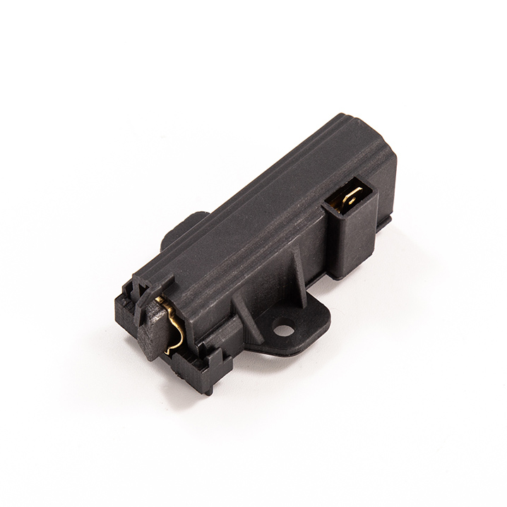 Carbon brush component is made by the material we named YD285-3-6, as well as spring, wire, terminal/tab, copper sleeve or iron sleeve and black plastic casing. Plastic casing resistant to high temperature, no more than 200 degrees. (usually around 150-180 degrees)Besides, carbon brush can be divided to double-layer/sandwich and single-layer.