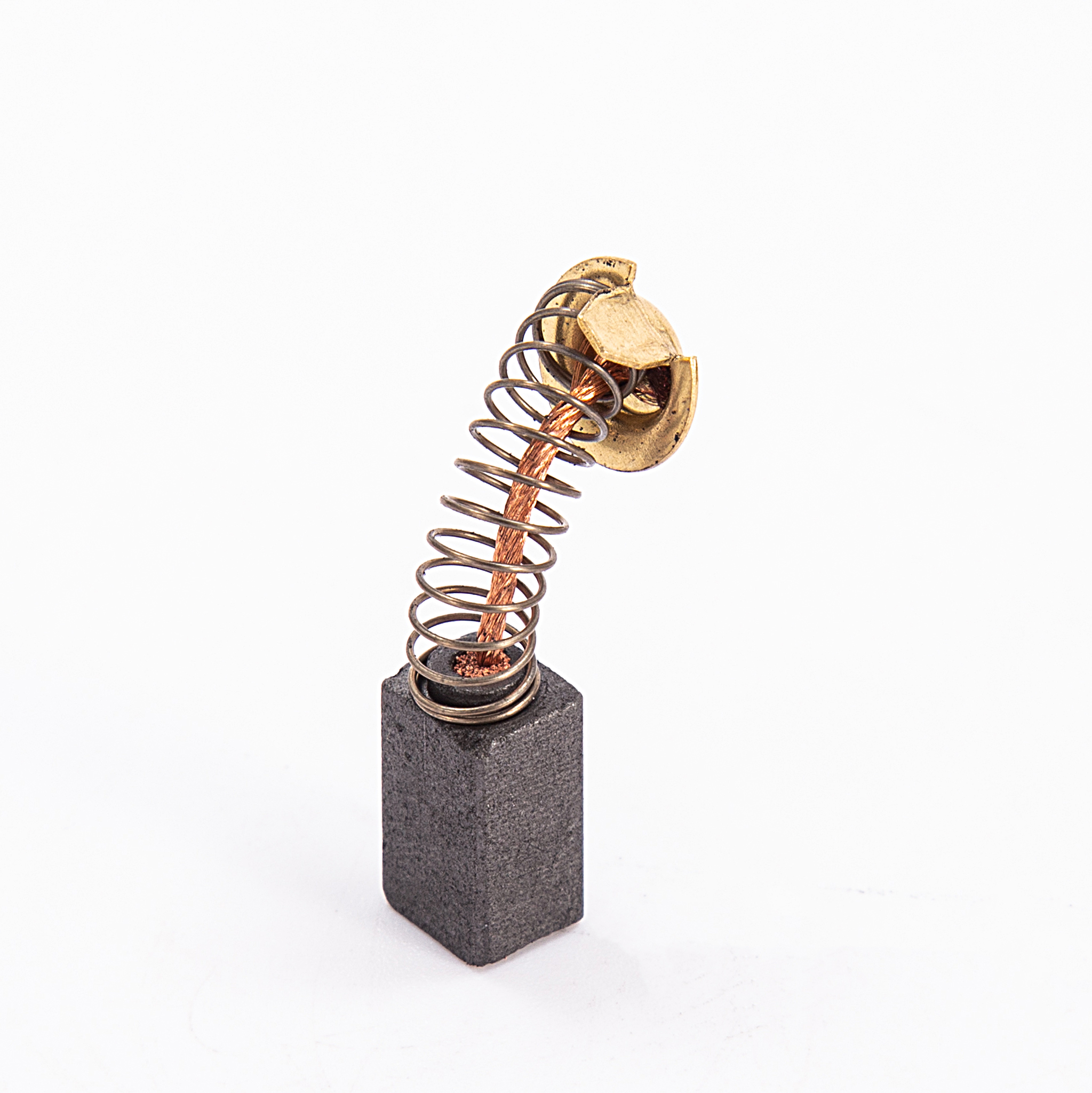 This carbon brush we named 999021, it is for HITACHI electric hammer or angle grinder. The most common materials are three types: electrographite, asphalt graphite, and resin graphite. This carbon brush has tab, wire and spring. Usually for maintenance, tab is copper plated iron, and spring is normal too. But it also can be used by copper tab and stainless steel spring. It all depends on customers' requirements.